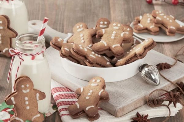 4. Unta una galleta con 6 g de Nutella y monta 2 muñecos de jengibre. Para hacer el glaseado, mezcla el azúcar glas con el jugo de limón, media cucharadita a la vez, hasta obtener una pasta suave y luego transfiere a una manga pastelera. Decora cada galleta con glaseado.