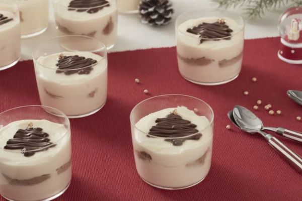 6. Toma 8 vasos y en cada uno de ellos agrega la crema de mascarpone, seguido de una capa de galletas y de nuevo otra de crema. Con la ayuda de una manga pastelera, dibuja un árbol de Navidad con 15 g de Nutella y con las perlas doradas en lo alto del árbol.