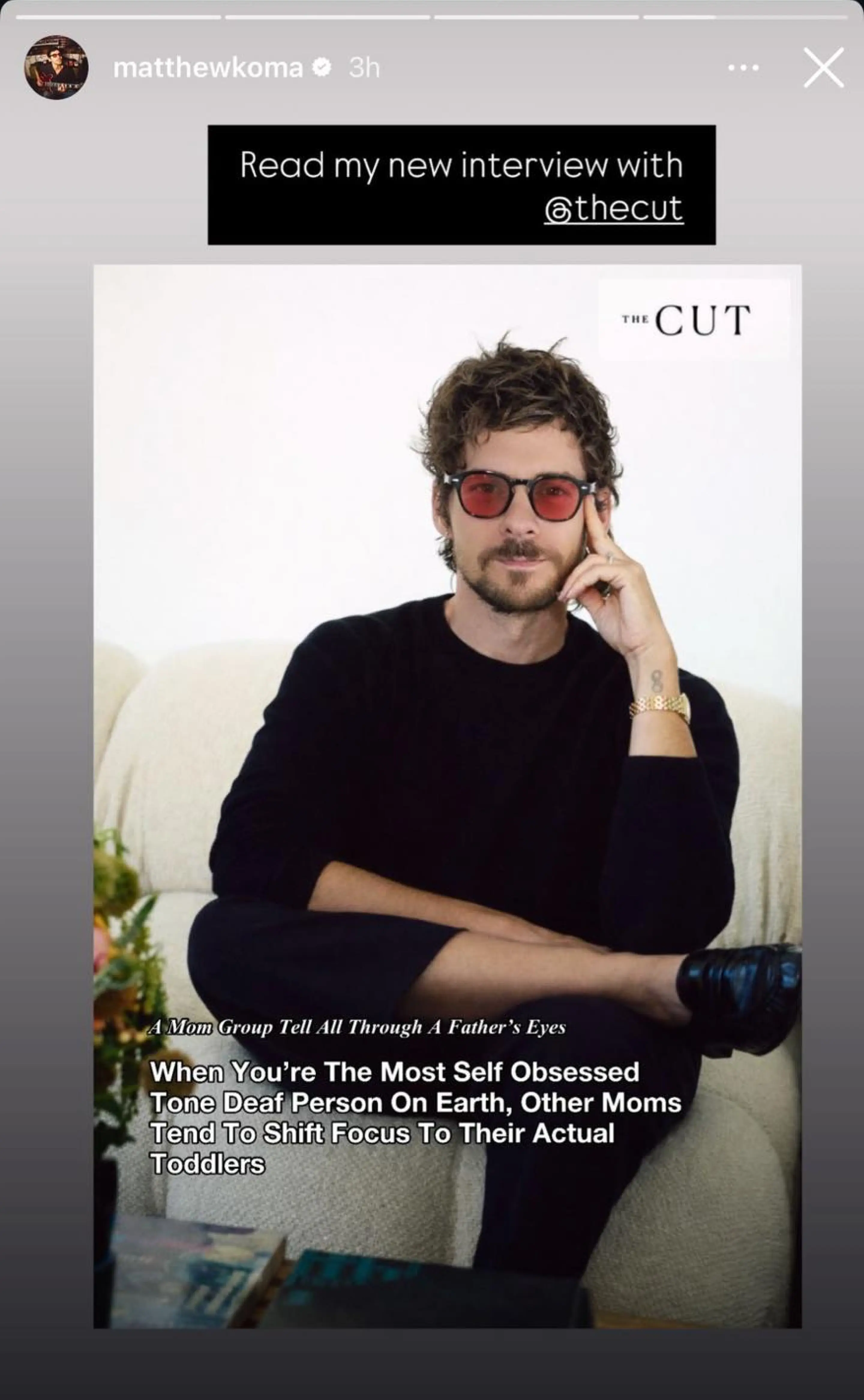 Koma compartió una historia de Instagram en la que imita la fotografía del artículo de Ashley, visitiendo completamente de negro, sentado en la misma pose y editada con el nombre de la publicación: The Cute.