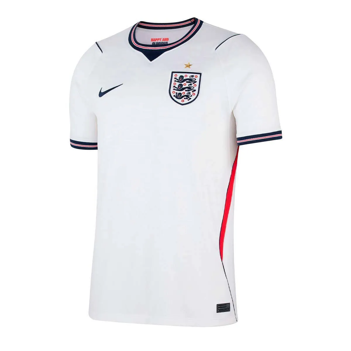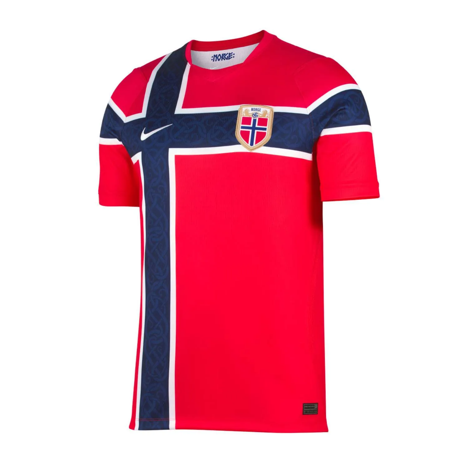 El rojo intenso domina, pero es la cruz —en azul profundo con contornos blancos— la que realmente estructura todo el diseño. No es solo un guiño a la bandera: es el eje visual que le da carácter y peso a la playera. Además, el patrón dentro de la cruz añade textura sin robar protagonismo, mientras que el escudo con borde dorado eleva el conjunto y le da un toque más premium.