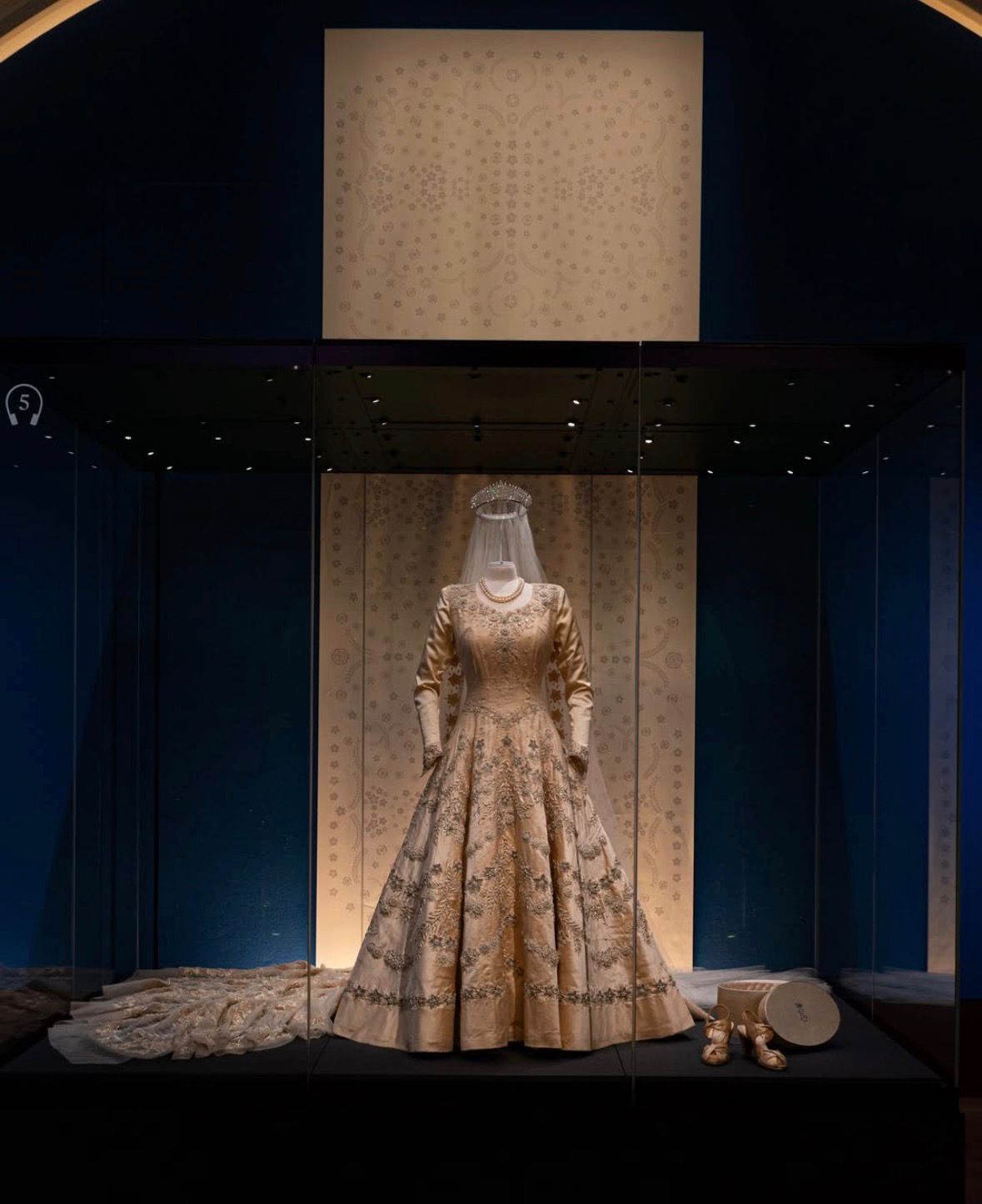 Entre los grandes protagonistas están dos piezas clave que marcaron momentos históricos. Por un lado, el vestido de novia de 1947, diseñado por Sir Norman Hartnell, elaborado en seda marfil y decorado con miles de perlas, símbolo de esperanza tras la Segunda Guerra Mundial.